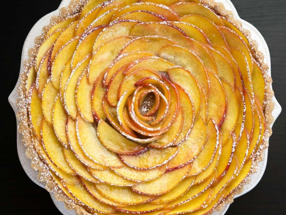 4. Arrange peach slices in a circular pattern or pattern of your desire on top of the preserves. Don’t let the picture fool you, the rose is incredibly easy and worth the extra 3 minutes of work. Tip: Start from the outside of the tart and work your way in.